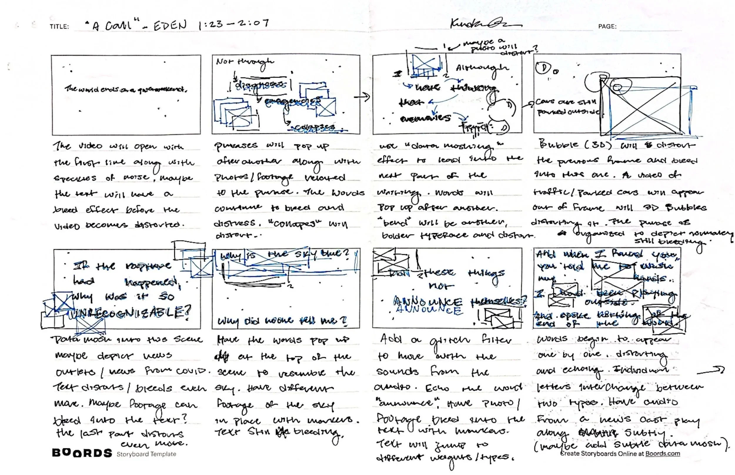 Below is the storyboard used to guide the final vision. The left is the sketched storyboard, and the right is the digital storyboard.