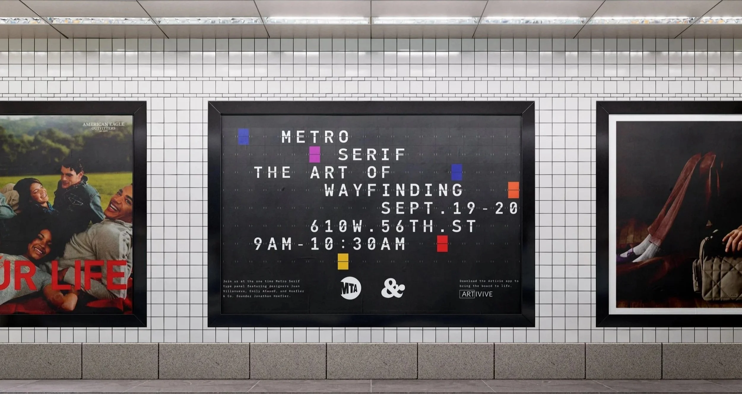 “Metro Serif: The Art of Wayfinding” is a print-to-motion poster for a fictional panel on New York City’s subway wayfinding system, hosted by MTA New York Transit and Hoefler & Co. The design draws from split-flap displays from Grand Central Terminal, using PF Din Mono Pro Medium and IBM Plex Mono Light, with colors inspired by subway train routes. Through augmented reality, the poster flips to reveal guest speakers and event details before looping back to its static form.